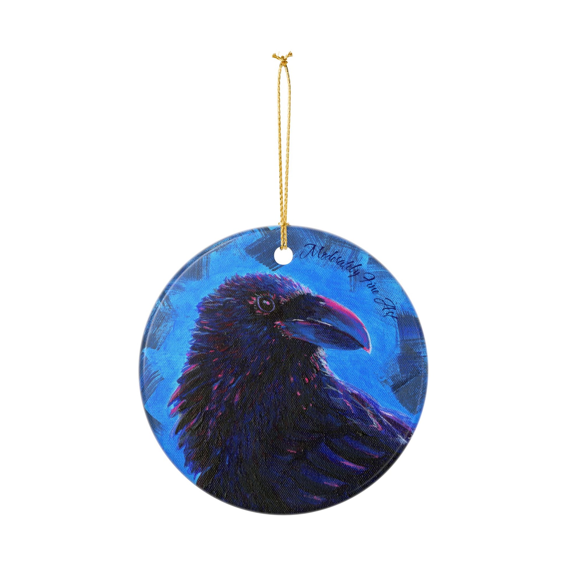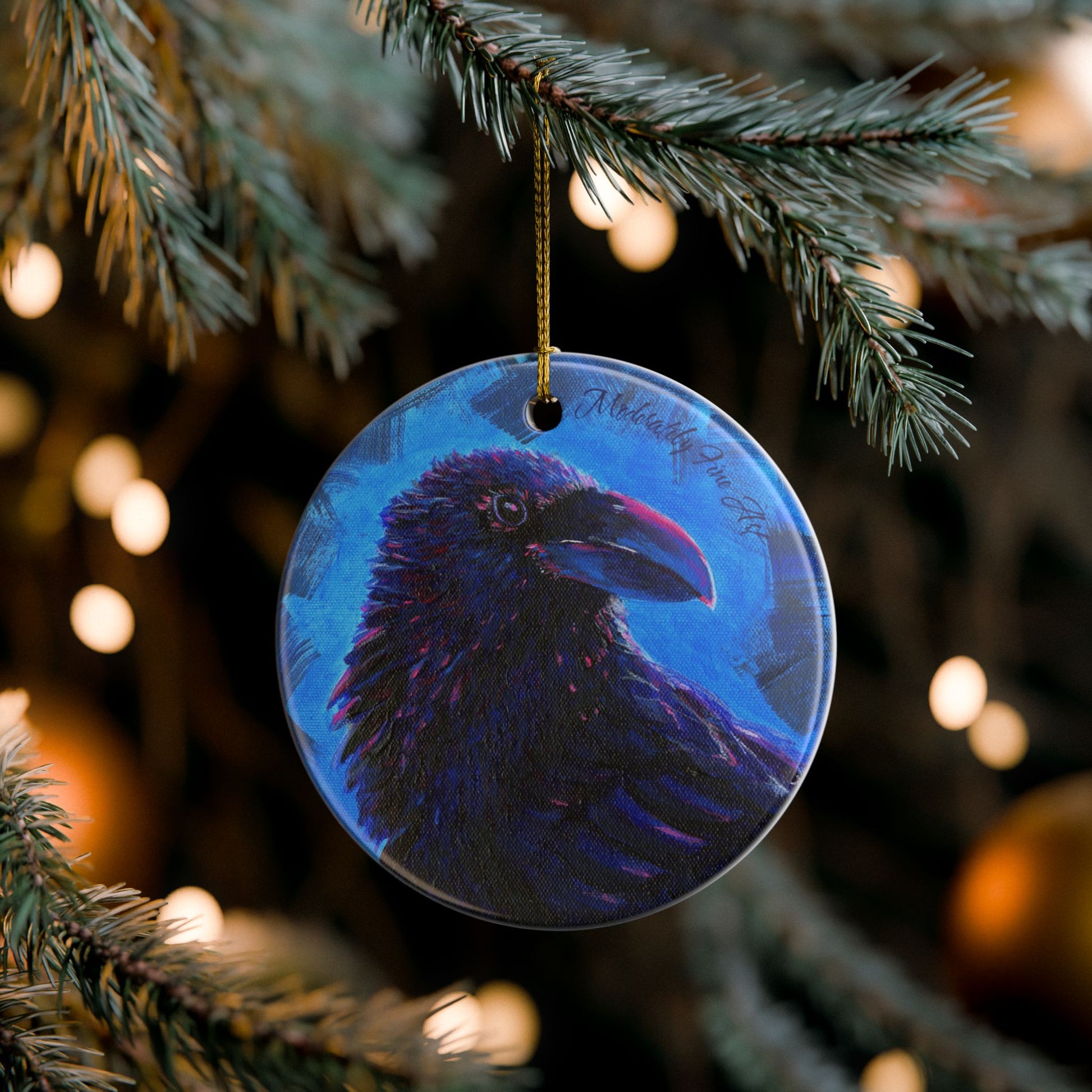 This ceramic ornament featuring a vibrant crow from Andy Carlson's Murder series of paintings will add a touch of moody style to your holiday decor. Perfect for those who appreciate unique and artsy decorations, this ornament is relevant for Christmas, Halloween, and any crow enthusiasts.