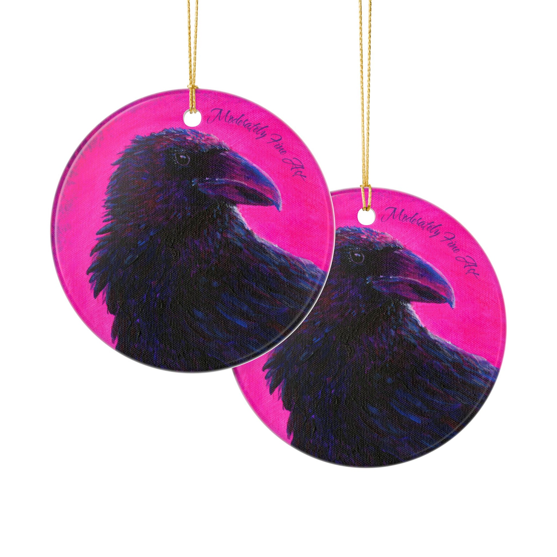 These 2-Side Print ceramic ornaments featuring a vibrant crow from Andy Carlson's Murder series are perfect for adding a touch of moody style to your holiday decor. Each ornament comes with a yellow string for hanging and is a great addition to any holiday tree or as a gift for art lovers and collectors. Relevant for Christmas, Halloween, and art-themed celebrations.