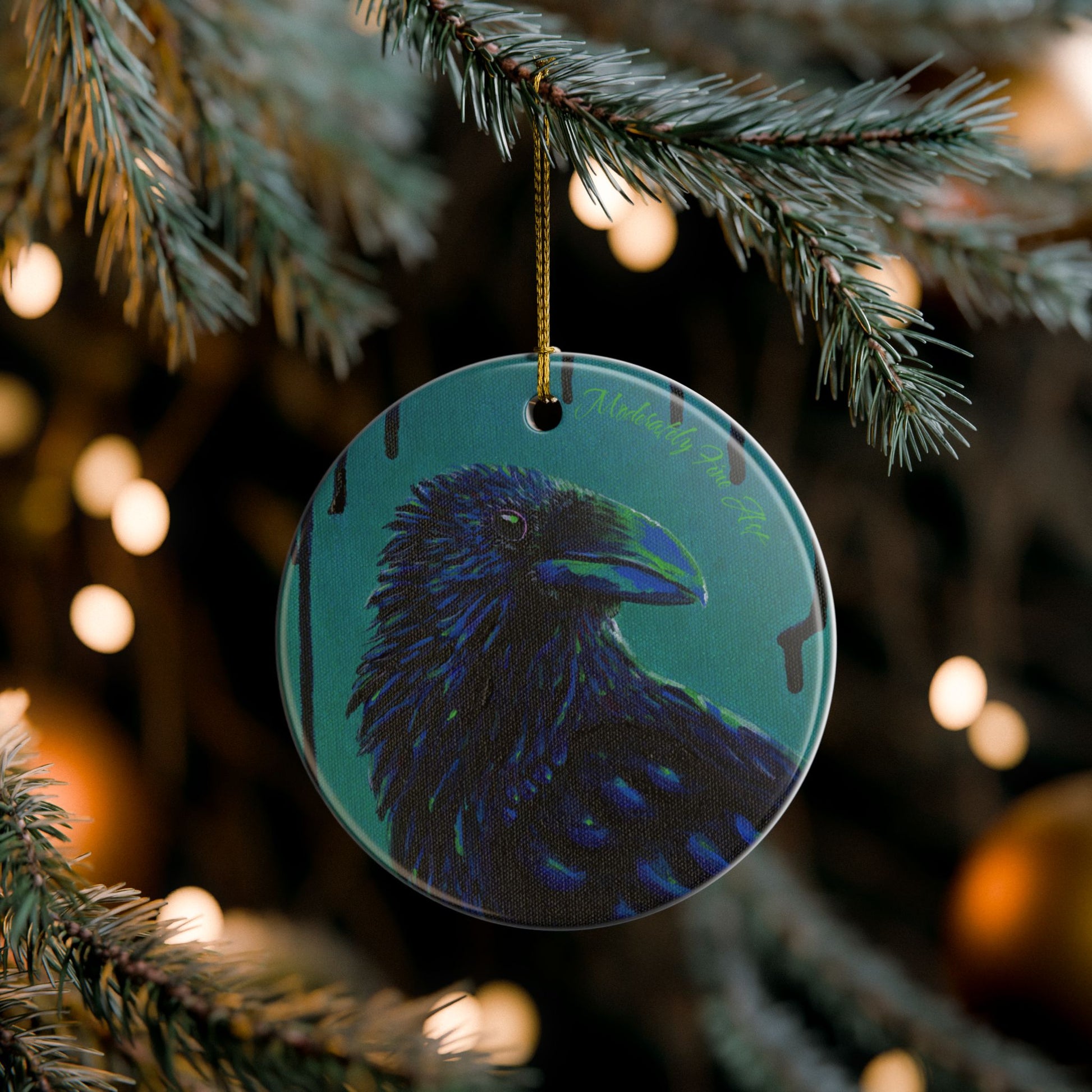 This ornament featuring a vibrant crow from Andy Carlson's Murder series of paintings will bring a touch of moody style to your holiday decor. Perfect for crow lovers and fans of unique holiday decorations, this ceramic ornament comes with a yellow string for hanging.